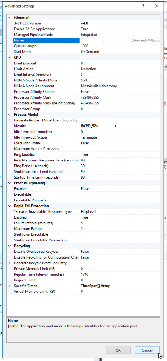 下面是应用程序池高级设置的屏幕截图;
