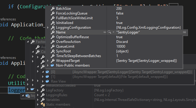 --我可以看到Sentry正在被初始化,但是它从不记录任何东西!同时,这些错误被记录到NLog中,没有问题.。