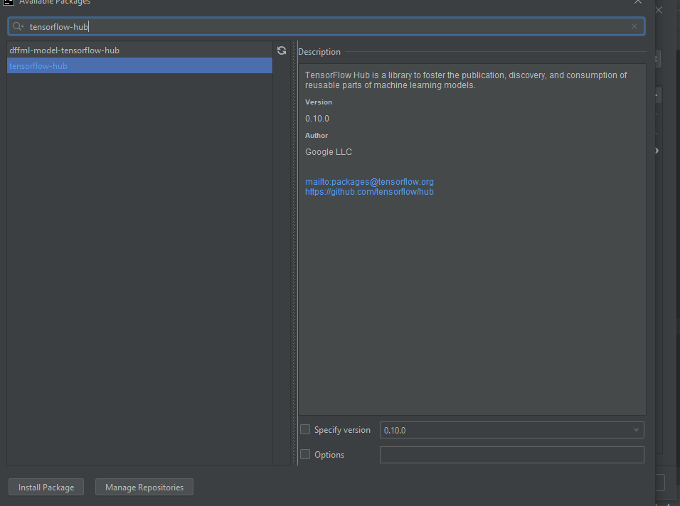 File => Settings... => Project => Python Interpreter => Add button => Search "tensorflow-hub" => Install Pakage使用tensorflow-hub而不是tensorflow_hub。他们是一样的。