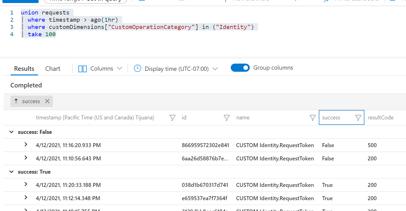 union请求> where时间戳>ago(1小时)>在(“标识”)中customDimensions"CustomOperationCategory“的位置取100