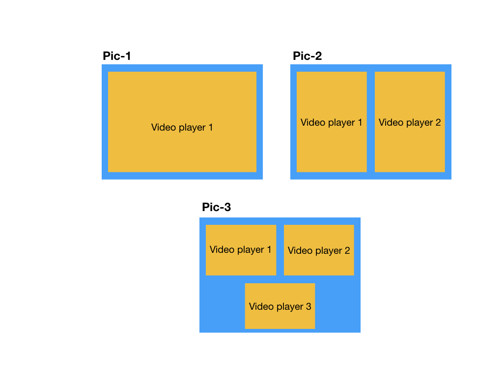 在变焦会议或信使会议中,每个参与者的视频容器动态获取高度和宽度。考虑到下面的图片,假设蓝色框是主要的容器-如果只有一个参与者,我需要给他/她(视频播放器1)的全部宽度和高度。