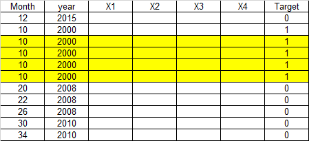 我有六个特性列和一个目标列,这是不平衡的。我是否可以像ADASYN那样进行过采样,或者只为X1、X2、X3、X4四列创建合成记录,方法是复制与常量(月份、年份)完全相同的记录。