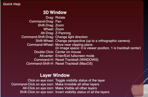 请记住,屏幕上有一个关于3D窗口和图层窗口中各种快捷方式摘要的快速帮助: