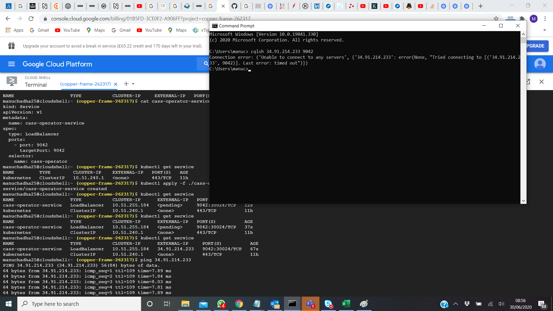 kubernetes ClusterIP 10.51.240.1 <none> 443/TCP 10h. 但是当我运行cqlsh 34.91.214.233 9042时,连接就失败了