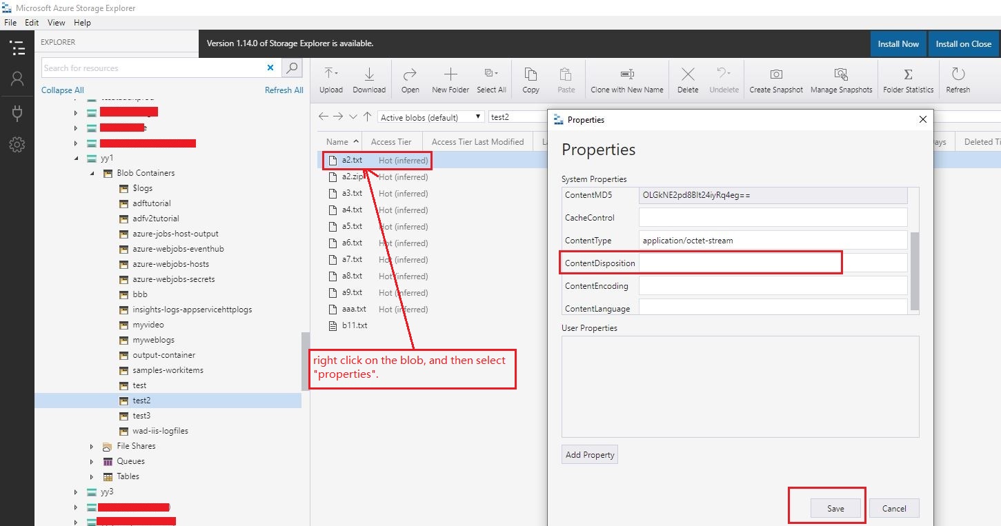 如果您不想下载这个工具,您可以导航到azure门户->存储帐户->,然后在左边的刀片上单击"Storage (预览)“->,然后您可以设置属性: