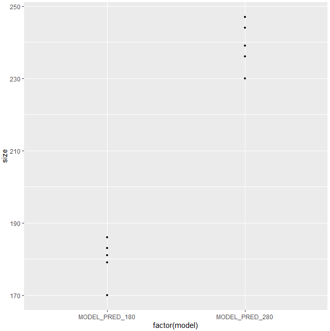 ggplot(x, aes(factor(model), size, group = factor(model)))+