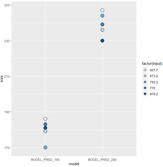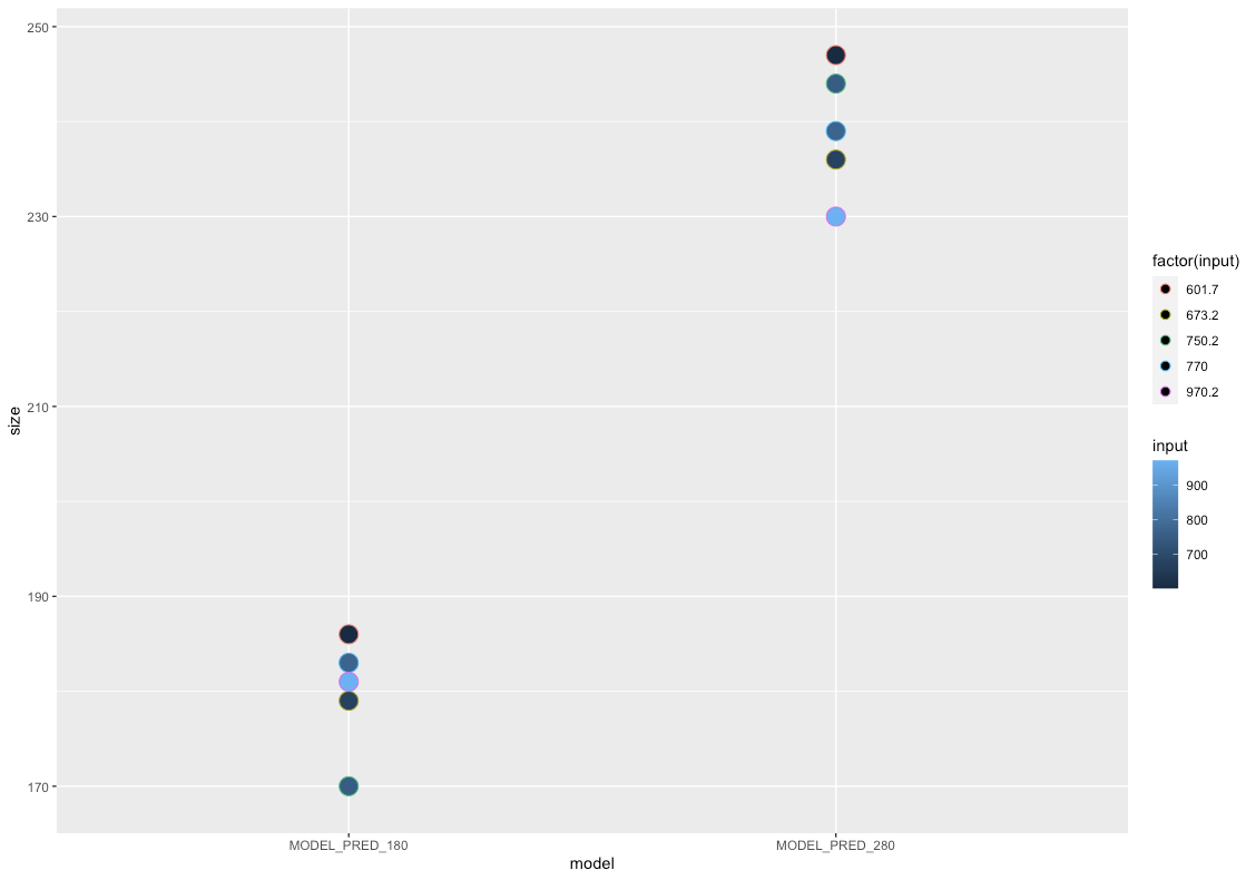 ggplot(x, aes(model, size, color = factor(input)))+