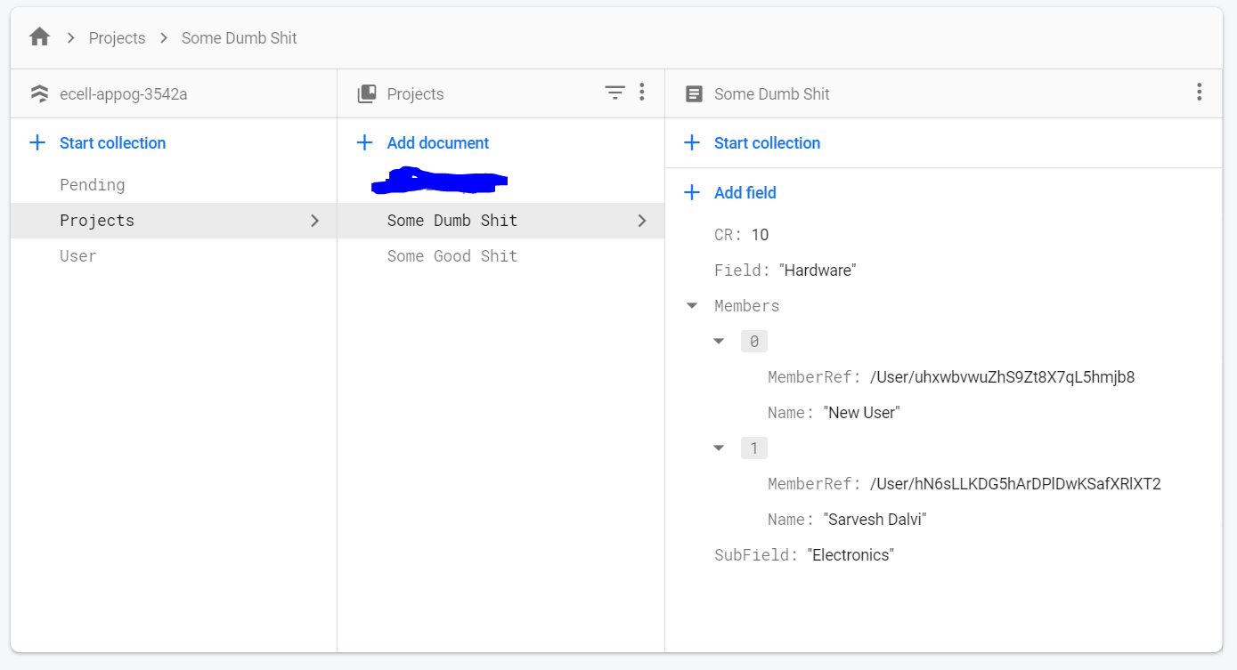 名称("Sarvesh Dalvi")存在于这个继承制度中:DocumentID(例如:“一些愚蠢的屎”)/数组(“成员”)/地图({名称:__,MemberRef :__});