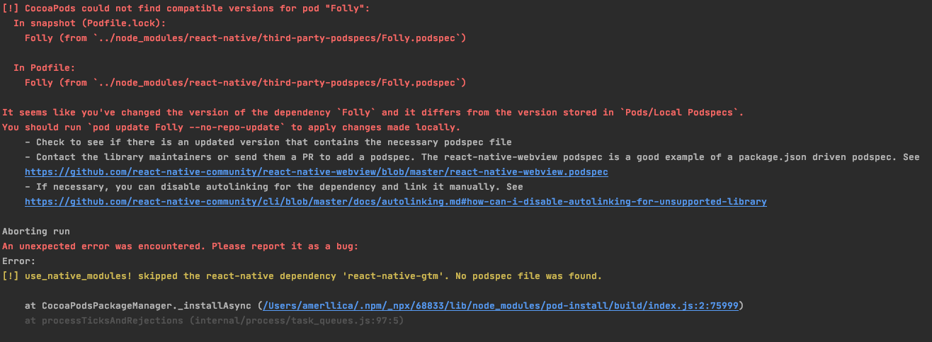 我使用的是React 0.62.2,现在我升级到0.63.0版本,在运行npx pod-install安装Pod软件包之后,我得到了以下错误: