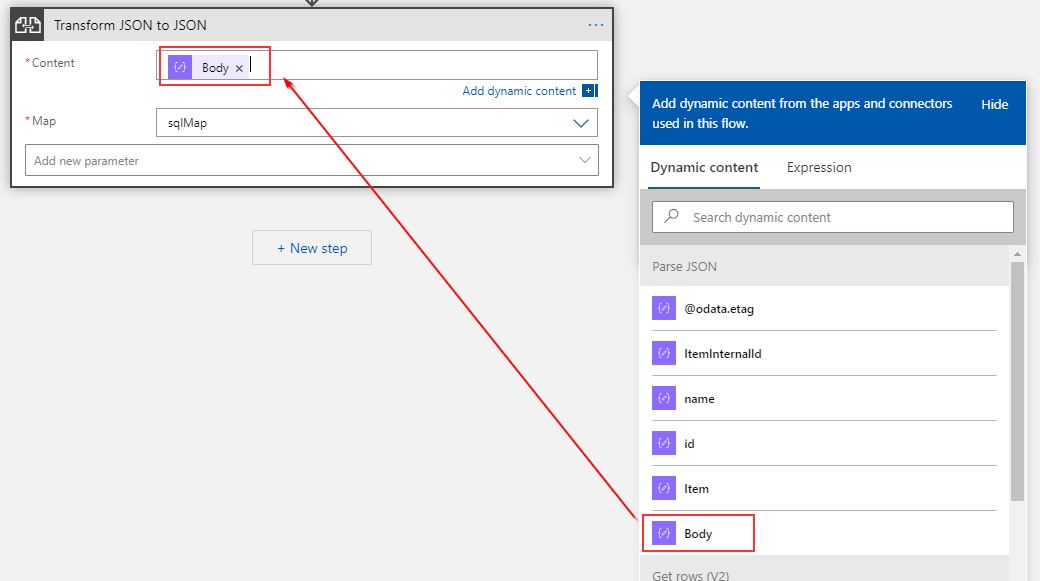 4.现在添加一个“将JSON转换为JSON”操作。从"Parse“中选择Body并将其放入"Content”框中。Body引用value在my (行)中的数据。