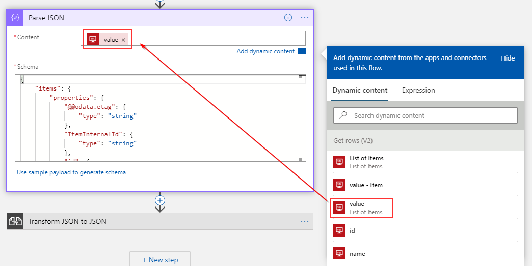 然后,我们需要使用“”操作来解析从表中得到的值(行)。请将“获取行(V2)”中的value放到"Parse“的"Content”框中。