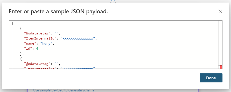 "@odata.context": "https://logic-apis-eastasia.azure-apim.net/apim/sql/xxxxxxxxxxx/$metadata#datasets('default%2Cdefault')/tables('%5Bdbo%5D.%5BPerson%5D')/items",