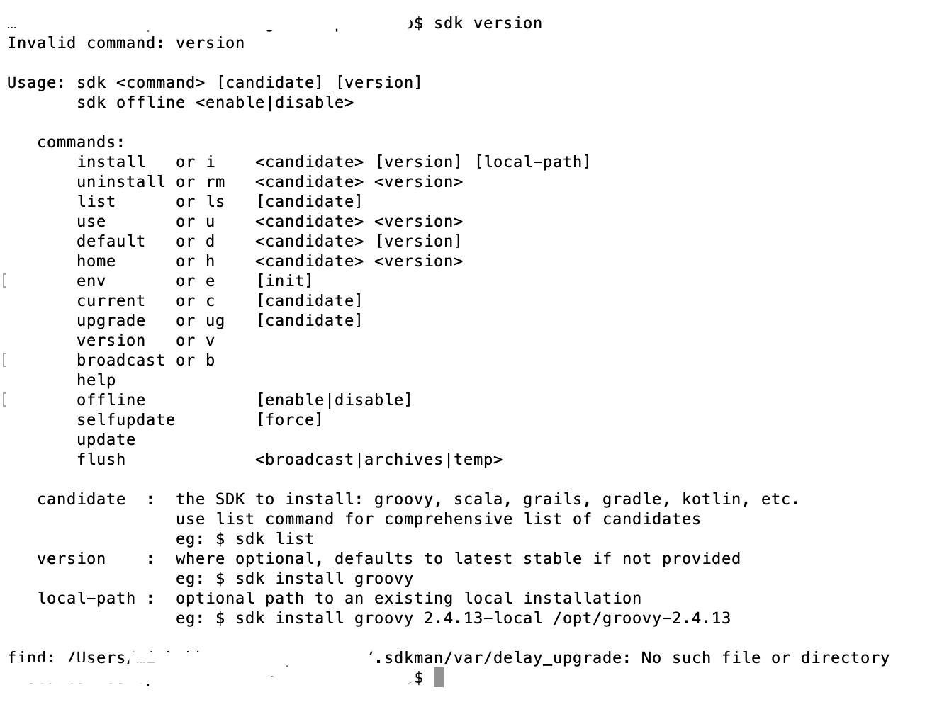 rm -rf ~/.sdkman当我在我的SDK version控制台上输入macOS时,我的卸载步骤不能工作,这就是当我输入SDK version时的结果。