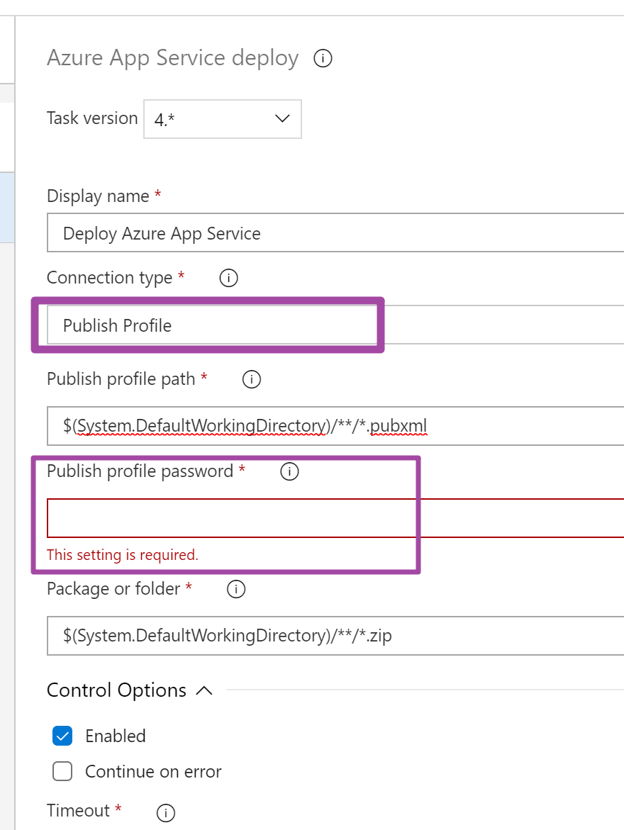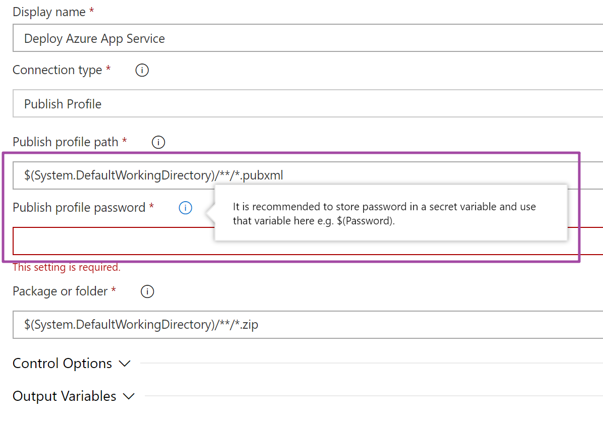 PublishProfilePassword(发布配置文件密码):配置文件的密码。考虑将密码存储在一个秘密变量中,并在这里使用该变量。示例:$(密码)。
