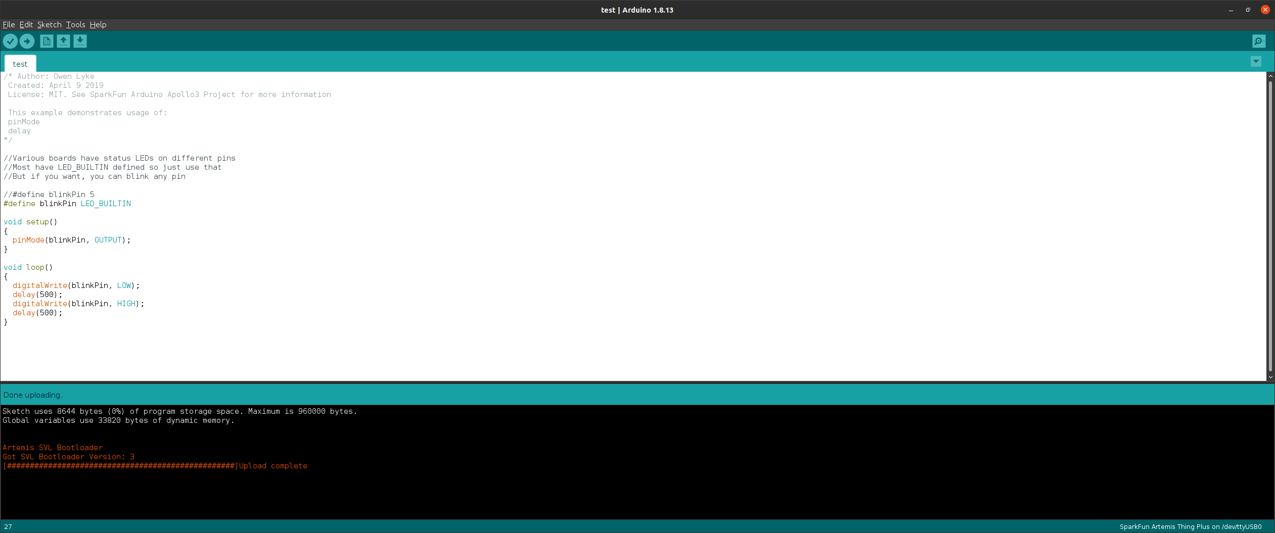 您还应该厌倦波特率您的Ambiq安全引导加载程序被设置使用。你说你上周买下了这个板--所有通过SparkFun.com出售的板都被设置为921600波特的ASB引导加载器。确保在Arduino tools菜单中选择了正确的选项。