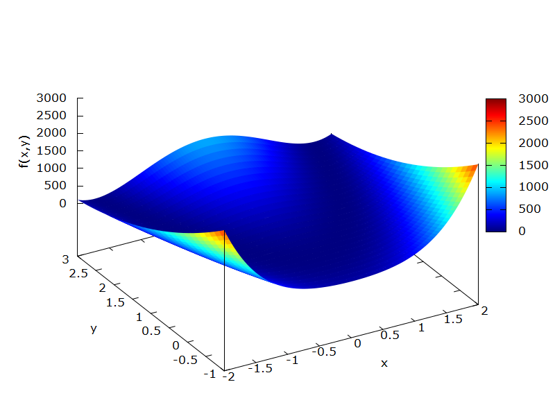 splot [x=-2:2] [y=-1:3] (1-x)**2+100*(y-x**2)**2 with pm3d notitle
