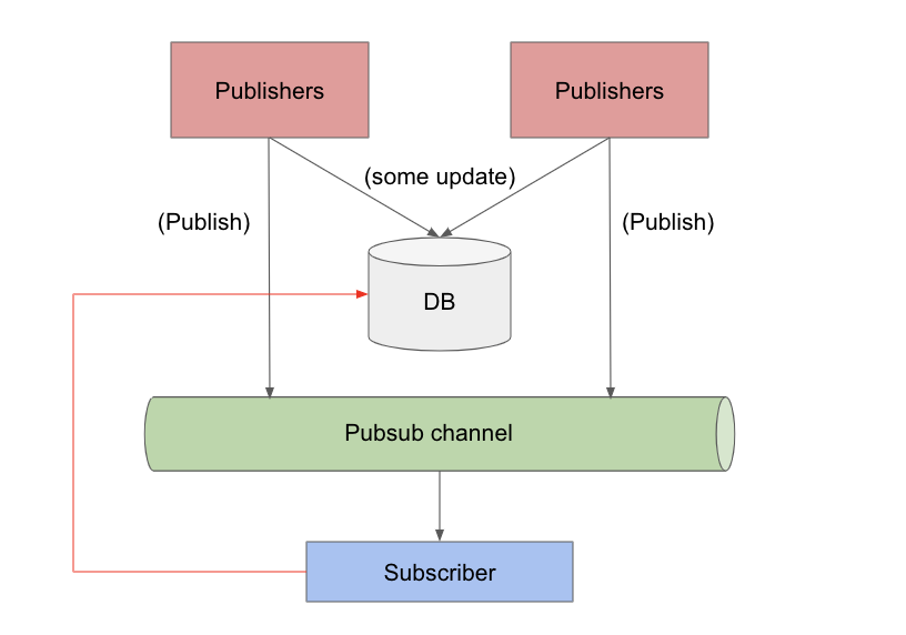 一些DB状态发生了变异,发布者通过pubsub通知该更改。但是它们在消息中包含了足够的信息,这样订阅者就不需要对DB进行查找了。假设订阅服务器拥有DB的缓存。它可以接收突变或新状态,并在不进行查找的情况下更新缓存。