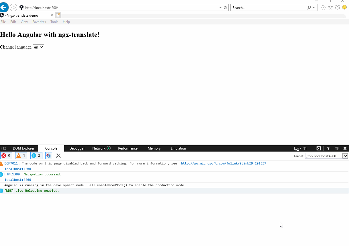 我找到了相似的线,我遵循了它的解决方案,然后它可以很好地在IE11中工作。我使用ngx-翻译,像这样的简单样本。你可以参考我的档案: