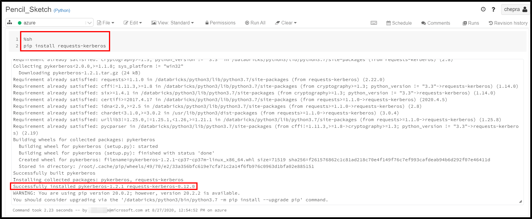 ERROR: Command errored out with exit status 1: /databricks/python3/bin/python3.7 -u -c 'import sys, setuptools, tokenize; sys.argv[0] = '"'"'/tmp/pip-install-k1b9yec8/pykerberos/setup.py'"'"'; file='"'"'/tmp/pip-install-k1b9yec8/pykerberos/setup.py'"'"';f=getattr(tokenize, '"'"'open'"'"', open)(file);code=f.read().replace('"'"'\r\n'"'"', '"'"'\n'"'"');f.close();exec(compile(code, file, '"'"'exec'"'"'))' install --record /tmp/pip-record-tfttk2g6/install-record.txt --single-version-externally-managed --compile --install-headers /databricks/python3/include/site/python3.7/pykerberos Check the logs for full command output.我很感谢你的帮助