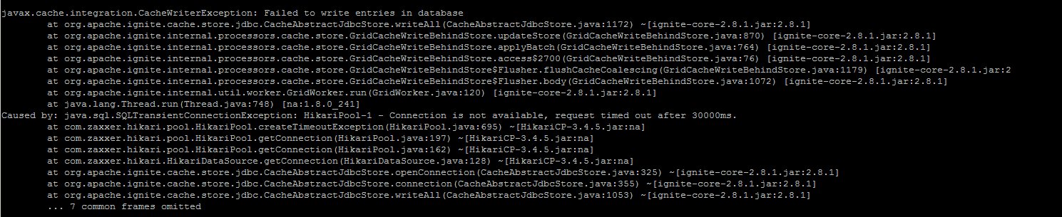 我得到了CacheWriterException,连接池正在超时。数据源是由Spring配置的默认hikari datasource (通过写入可以正确地工作)。