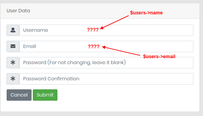 <input type="text" id="username" name="name" placeholder="Username" class="form-control" value="{{$users->name}}">