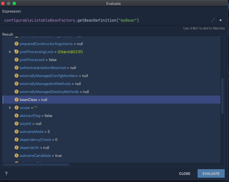 Root bean: class [null]; scope=; abstract=false; lazyInit=null; autowireMode=3; dependencyCheck=0; autowireCandidate=true; primary=false; factoryBeanName=myConfigurationClass; factoryMethodName=myBean; initMethodName=null; destroyMethodName=(inferred); defined in com.example.MyConfigurationClass