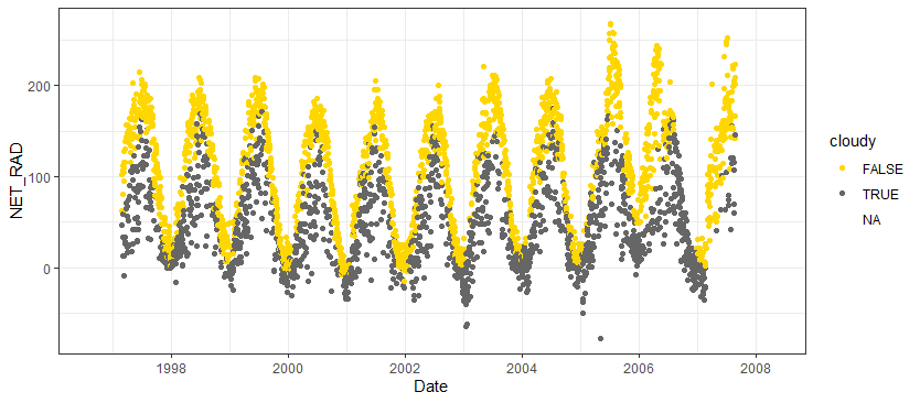 df$cloudy <- as.logical(net_rad_decomp$random < 0)这样,我们就可以绘制数据,显示那些在黄色中异常明亮的日子,以及那些在灰色中显得异常暗淡的日子: