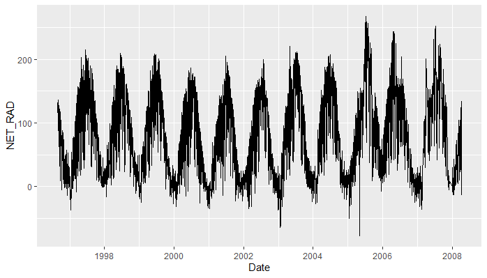 df <- df[!is.nan(df$NET_RAD),]如果我们绘制每日净辐射图,我们可以看到一个明显的季节模式:
