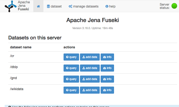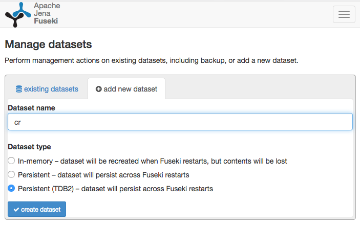 configuration/cr.ttl被创造出来了。对于较小的数据集,现在可以通过webgui添加数据。对于较大的数据集,数据库目录中需要原始加载的tdb数据的副本或符号链接。