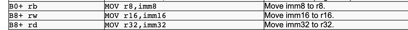 是,英特尔的状态代码是b8 +4字节,值为1字节立即移动.mov $0x1,%ax -> 66 b8 01 00