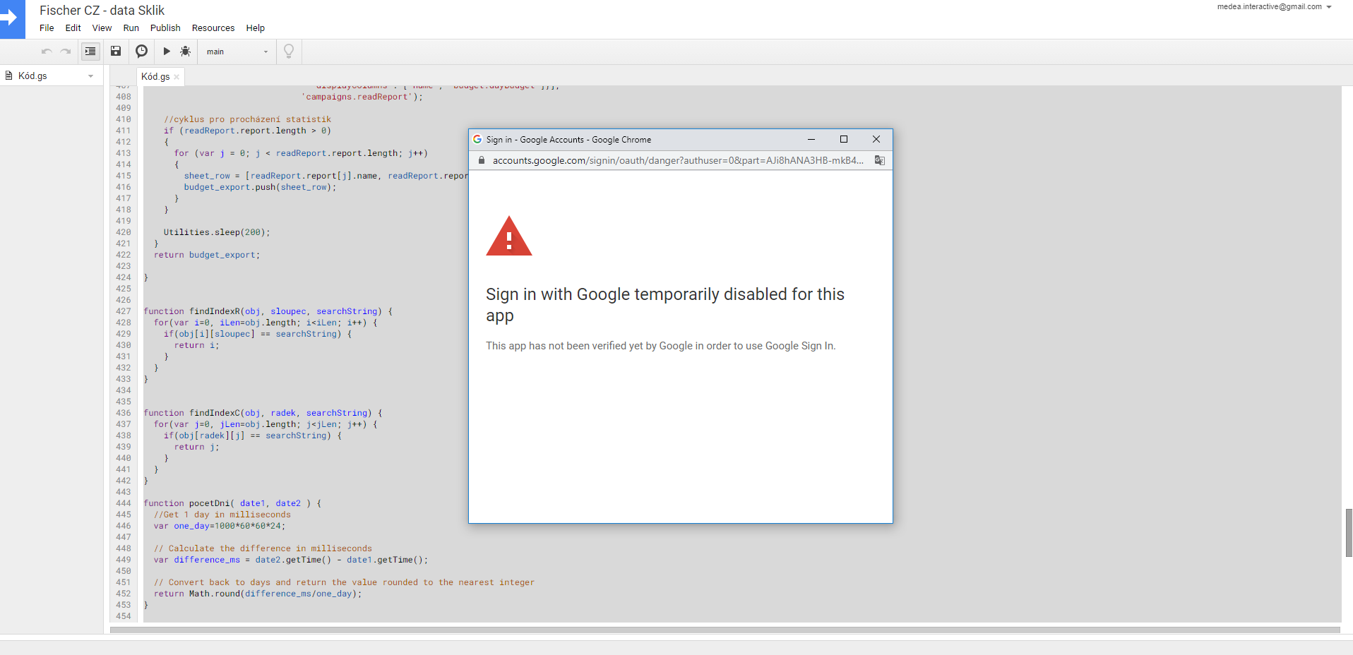 我们在google电子表格中对脚本的授权有问题。脚本从其他广告平台下载数据。签约后,我们就会警觉起来: