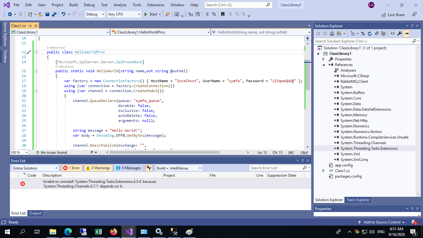 哦,我知道你想做什么--你想叫兔子,我想你在使用最新的兔子客户端dll。我有一个模糊的回忆,后来的dll不能部署到SQL中。事实上,我曾在2017年写过一篇关于如何做到这一点的博文。看一看这篇文章,看看它是否对你有帮助。