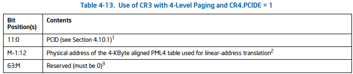 因此,当设置CR4.PCIDE时,将CR3的12 (0:11)较低的位用作PCID,即“进程上下文标识符”(通常为48的从12到M1的位用于PML4表基础的物理地址)。