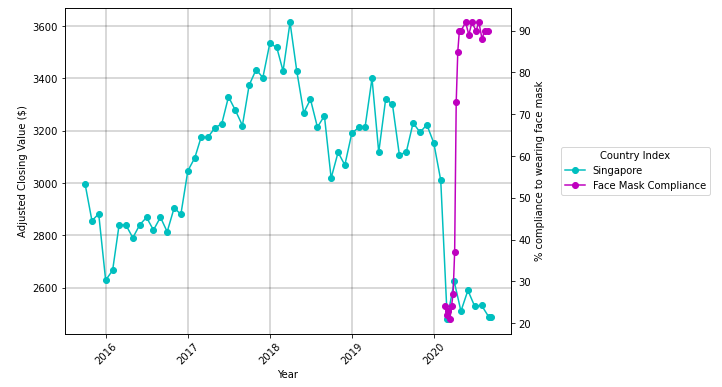 curve2 = ax6.plot(z.index, 'Singapore', data=z, label = "Face Mask Compliance", color = "m", marker='o')