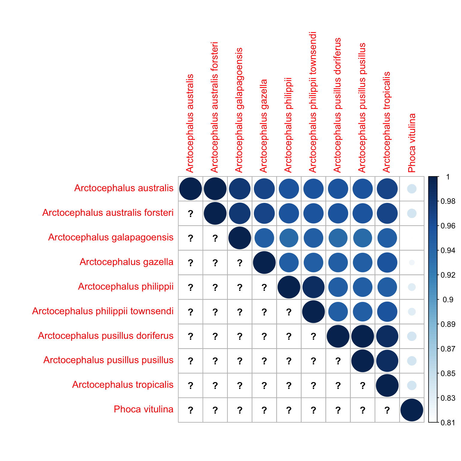 我的代码:corrplot(Phylogeny, is.corr=FALSE,method="number", cl.lim=c(0,1))