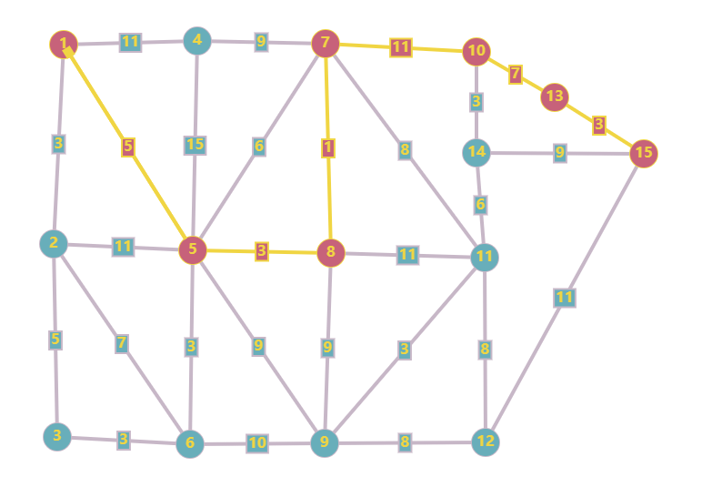 为了更好地定义这个问题,如下图所示,红线是node 1和node 15之间的最短路径,最短路径是1 ->5 ->8 ->7 ->10 ->13 ->15。