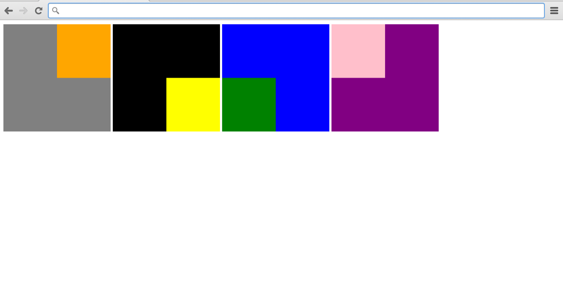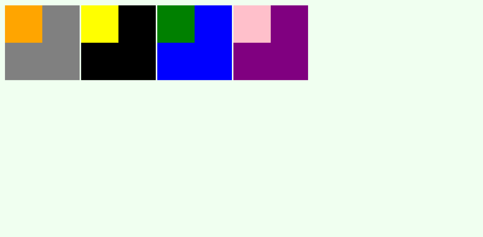 但我搞错了。这四个方块被组合成一个元素,显示被设置为内联块。我想移动他们父母里面的小盒子,我想我应该用"display: flex“和”their content: flex-end“来做,比如下面的代码。我在HTML和CSS中的代码如下所示。