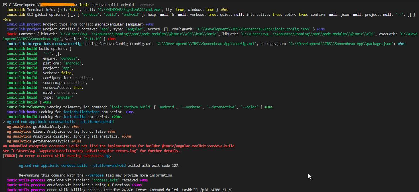 运行应用程序:离子型-cordova- builder =android发生了一个未处理的异常:找不到用于builder的实现,请参阅"C:\Users\username\AppData\Local\Temp\ng-DhZAYC\angular-errors.log“获取更多详细信息。运行子进程ng时发生错误。