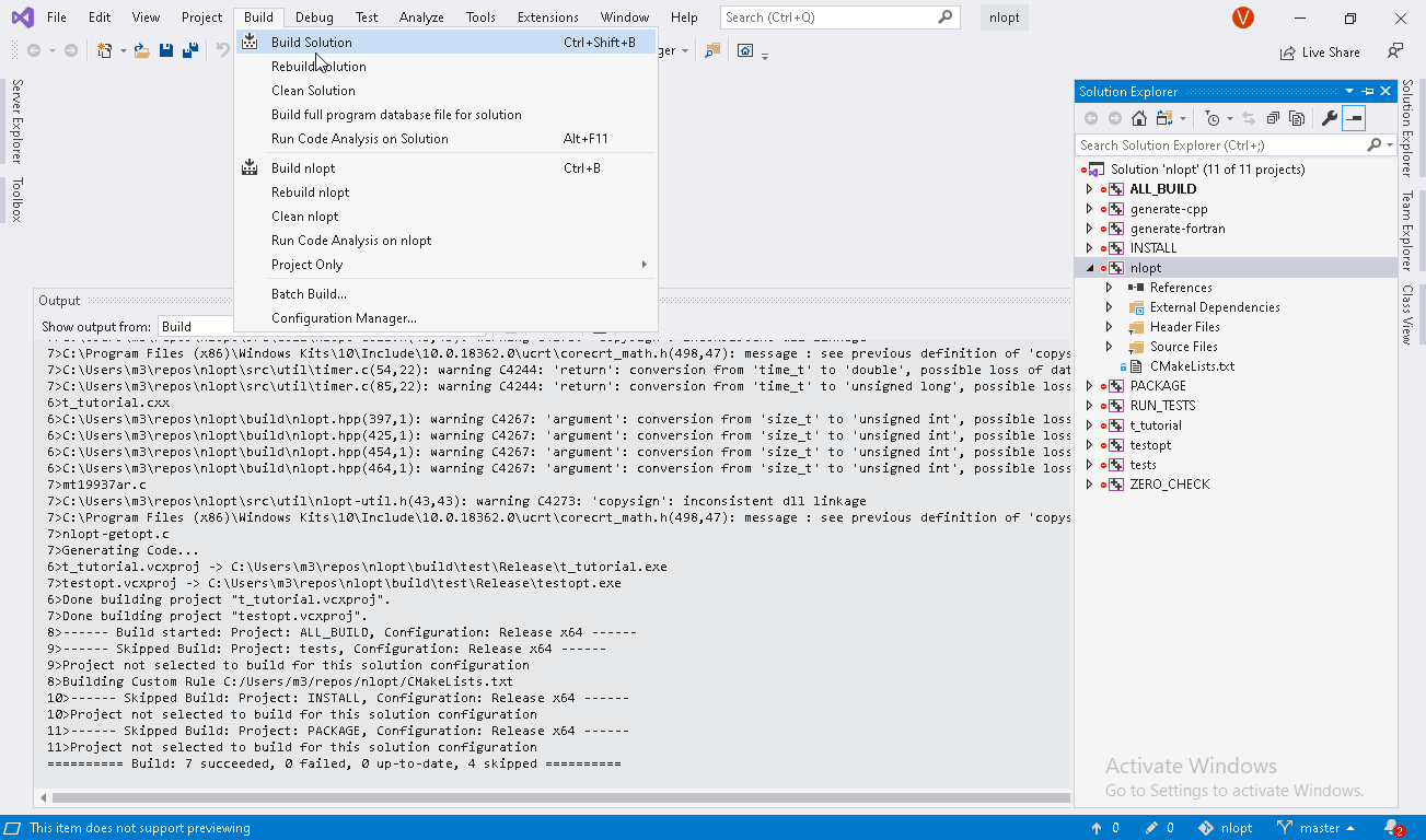 最后,我通过Visual在nlopt.sln目录中打开build Visual解决方案文件构建了它。然后,将菜单Build > Build Solution用于调试和发布模式.