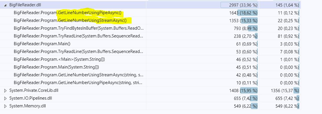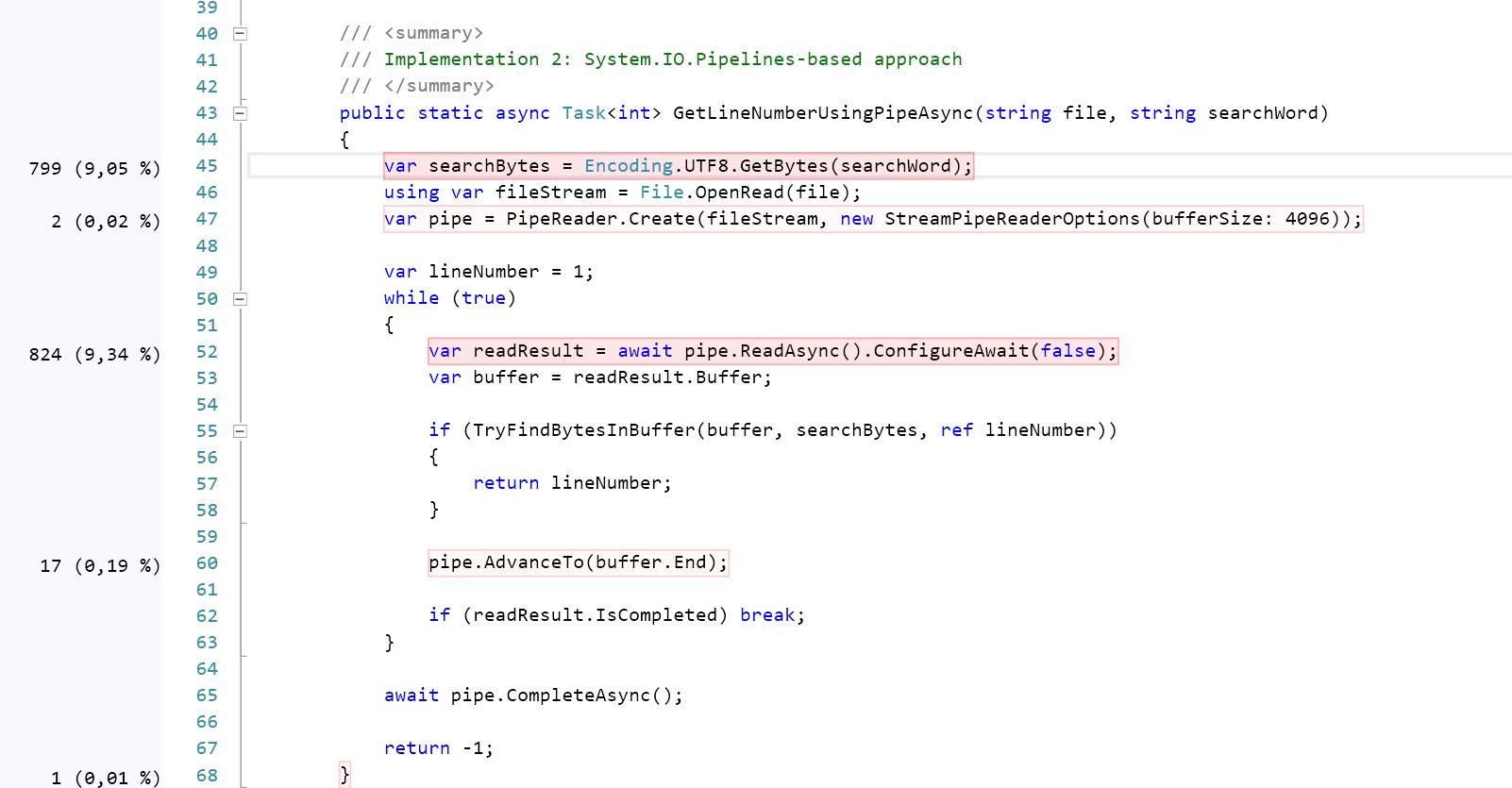 使用代码分析案例进行更深入的挖掘表明,第二个(GetLineNumberUsingPipeAsync)比使用流的CPU强度高21.5 %(请查看屏幕截图),它与我得到的基准测试结果相当接近: