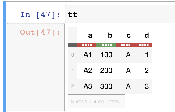 tt = dt.Frame({'a' : ['A1','A2','A3'], 'b':[100,200,300]})