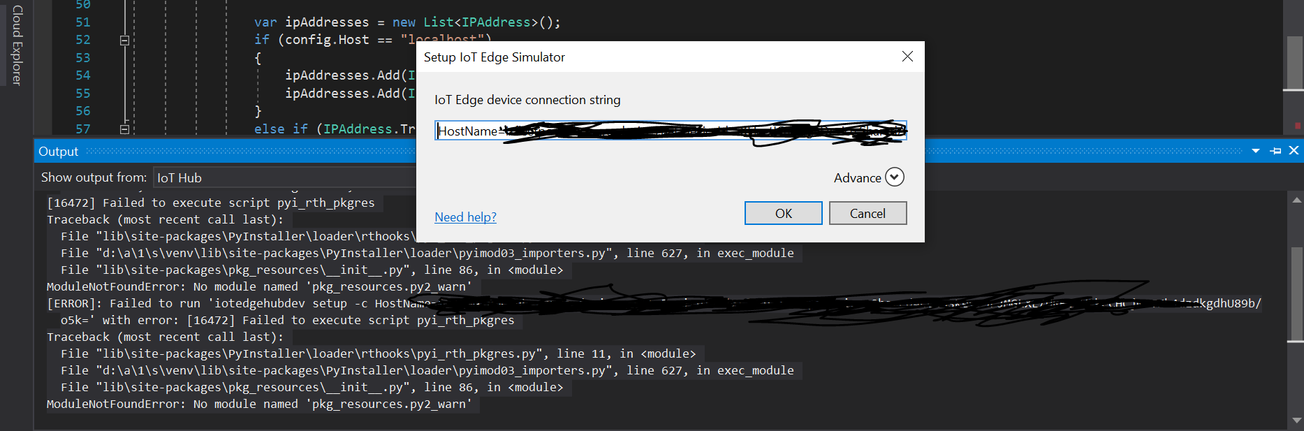 C:\Users\10070047\Documents\Visual 2019\iotedgehubdev\v0.14.2\iotedgehubdev安装程序"lib\site-packages\PyInstaller\loader\rthooks\pyi_rth_pkgres.py",HostName={connection } 16472未能执行脚本pyi_rth_pkgres跟踪(最近一次调用):文件pyi_rth_pkgres第11行,文件"d:\a\1\s\venv\lib\site-packages\PyInstaller\loader\pyimod03_importers.py",第627行,exec_module文件“lib\site-packages\pkg_pyi_rth_pkgres_init_..py”,第86行,在"lib\site-packages\PyInstaller\loader\rthooks\pyi_rth_pkgres.py",中,没有一个模块名为“pkg_resources.py2_warn”错误:未能运行“iotedgehubdev安装程序-c {connectionstring}”,其中有错误: 16472无法执行脚本pyi_rth_pkgres跟踪(最近一次调用):文件"d:\a\1\s\venv\lib\site-packages\PyInstaller\loader\pyimod03_importers.py",第627行中的文件pkg_resources.py2_warn第11行,在exec_module文件"lib\site-packages\pkg_resources_init_.py“中,第86行,在ModuleNotFoundError:没有名为'pkg_resources.py2_warn‘的模块中