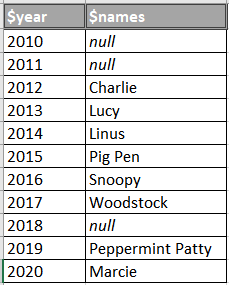 $years_names = "2012:Charlie,2013:Lucy,2014:Linus,2015:Pig Pen,2016:Snoopy,2017:Woodstock,2019:Peppermint Patty,2020:Marcie";