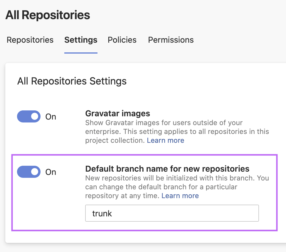 从sprint 176的部署开始,在项目级别具有编辑策略的人员可以为该项目中的新存储库选择初始分支的名称。该设置不会对现有的、已填充的存储库进行任何更改。