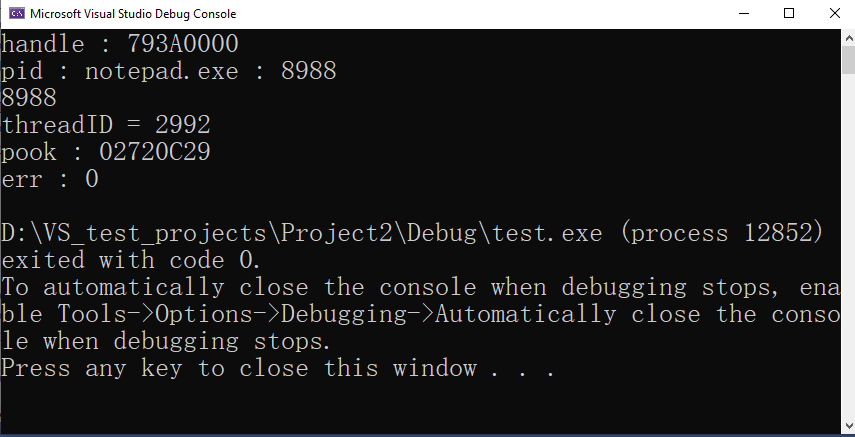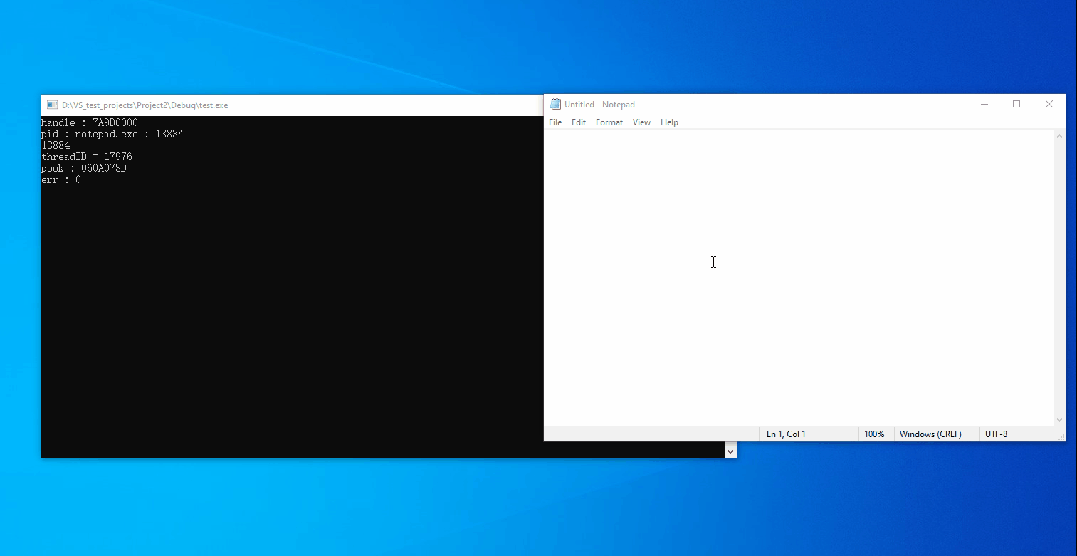 }在这种情况下,注入函数的SetWindowsHookEx似乎有问题。dll文件加载良好,内部的injectSuccess函数被很好地获取。(我试着运行它,但它成功了),我想知道SetWindowsHookEx的参数值是否输入错误,所以我对它们进行了比较,并不断地检查它们,但没有发现任何差别。因此,我尝试了GetLastError(),返回值为SetWindowsHookEx,但返回值为0,错误代码为87 (“参数不正确”)。