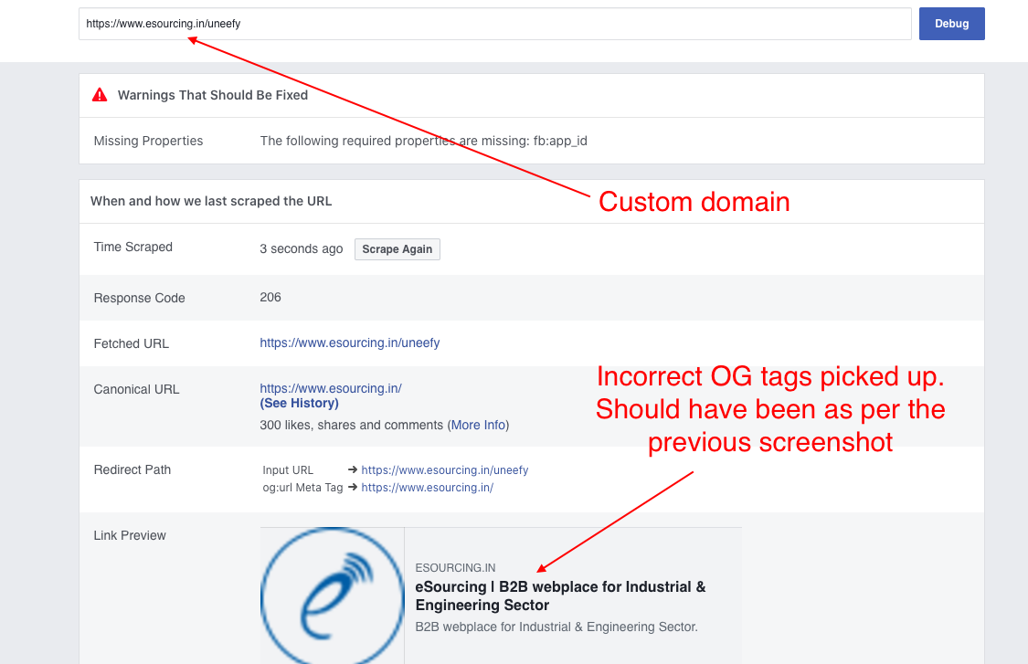 然而,当页面被Facebook爬行时,这个组件挂载就不会发生了。因此,您可以想象,当Facebook爬虫抓取这些页面时,og:url属性被设置为针对所有页面的https://example.com。