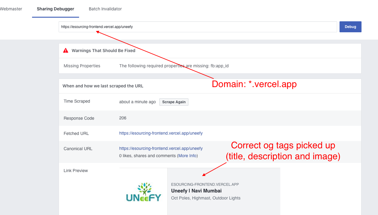 当我使用Facebook共享调试器检查特定url上的元标记时,当使用my-project.vercel.app域而不是实际域www.example.com时,元标记将被正确地拾取。项目在浏览器中正确加载,包括两个域的元标记。