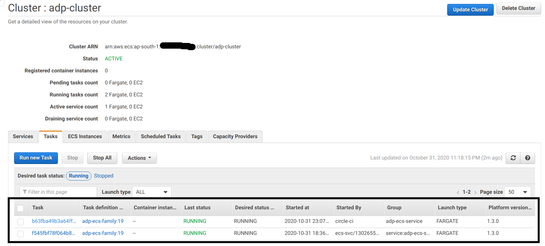 我使用循环CI构建映像并将其推送到AWS ECR,然后使用此映像在AWS ECS集群内的服务中部署容器(以FARGATE为实例)。问题是,这些任务在此服务之外运行,但在同一个集群中。