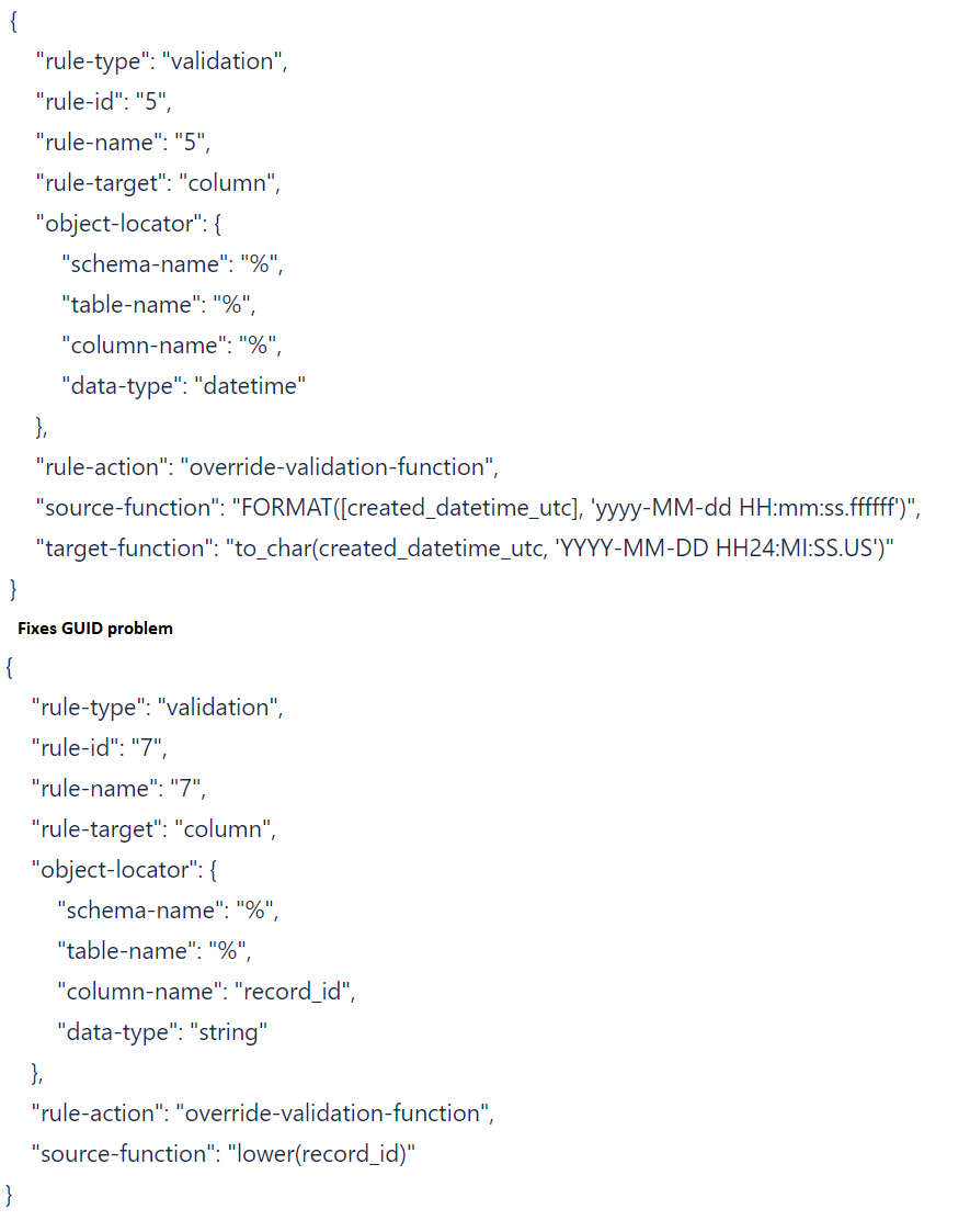 多亏了本文https://www.sentiatechblog.com/aws-database-migration-service-dms-tips-and-tricks,这些新的映射规则解决了所有验证问题。这些规则不能使用AWS控制台添加,只能在脚本中添加。