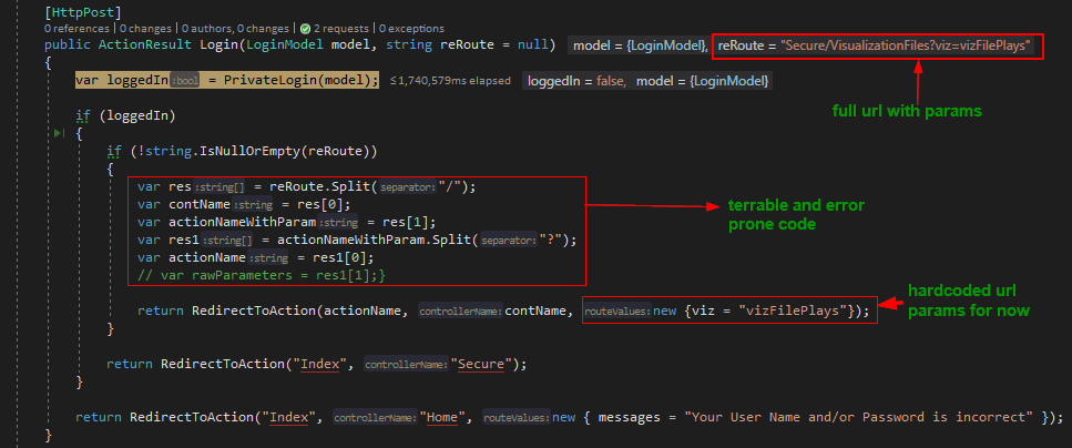 https://localhost:44358/Secure/VisualizationFiles?viz=vizFilePlaysLogin操作以登录(传递returnUrl)。现在,安全控制器方法使用ActionFilterAttribute,它拦截传入的HTTP请求并确保控制器;动作和参数作为returnUrl传递(在这种情况下为reRoute )。